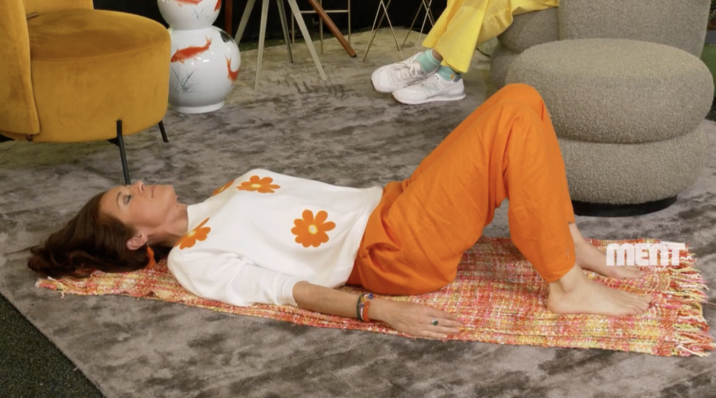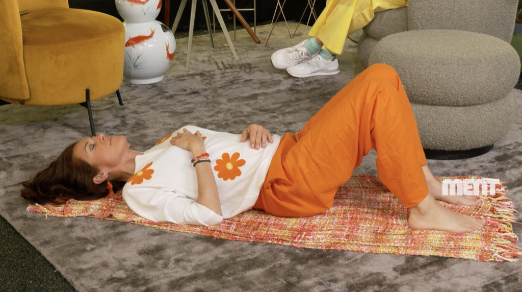 Amaryllis gaat nu de ademcore oefening doen uit Pilates. Dat is een hele aangename oefening waarbij je eigenlijk op de grond ligt met ingetrokken benen. Armen ontspannen naast je, je knieën dus gebogen, je voeten plat op de grond en je legt één hand op je buik en één op je borst.